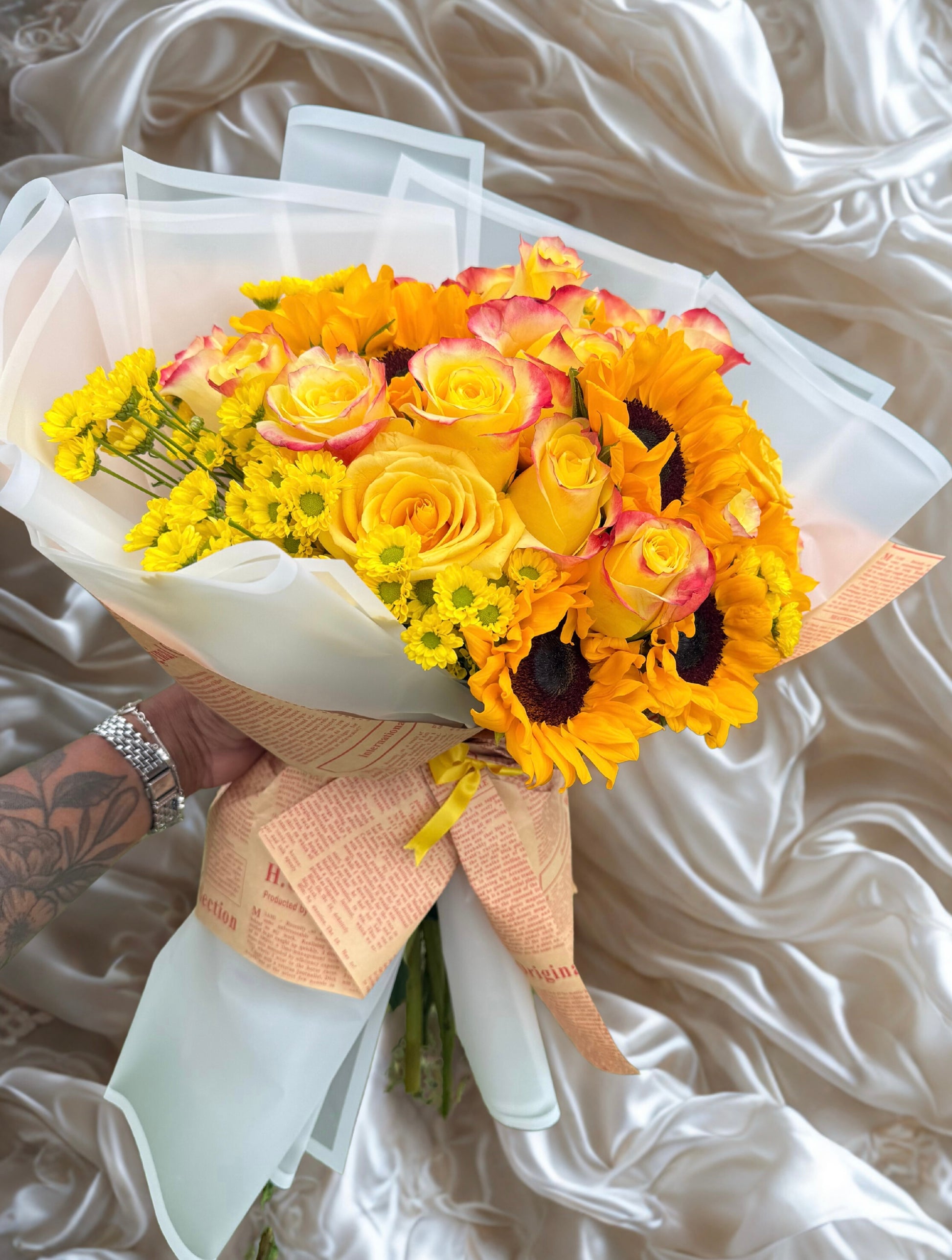 Bursting with sunshine and warmth, the Golden Glow Bouquet features a radiant mix of fresh sunflowers, yellow roses, bicolor roses with blush-pink tips, and bright yellow mini chrysanthemums. Wrapped in elegant parchment-style paper with a modern matte finish and tied with a cheerful yellow ribbon, this hand-tied arrangement is perfect for birthdays, celebrations, or simply to brighten someone’s day.