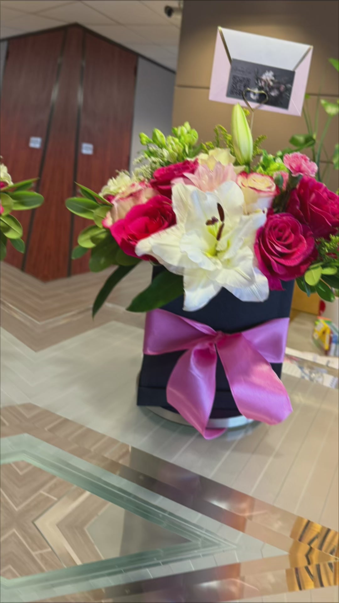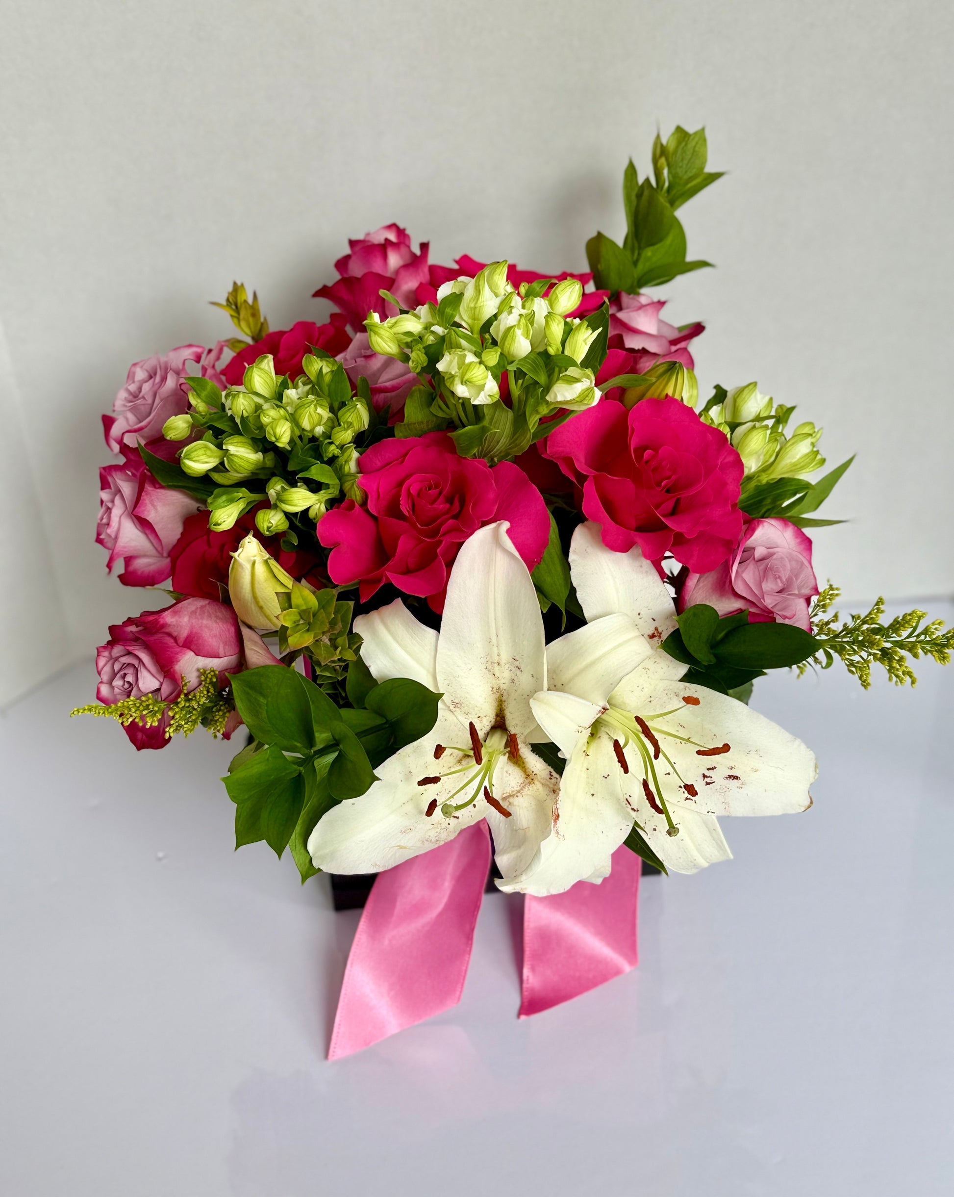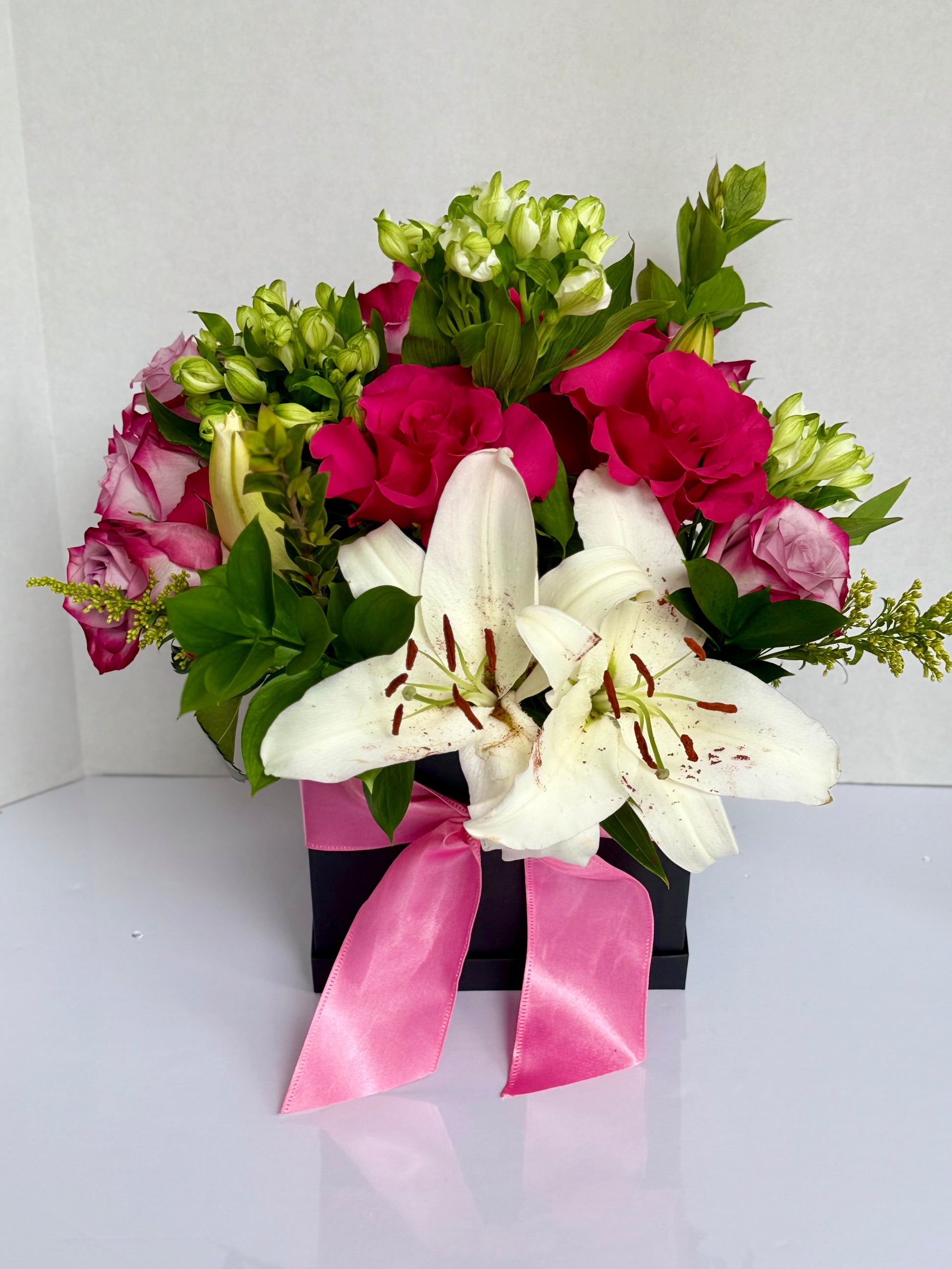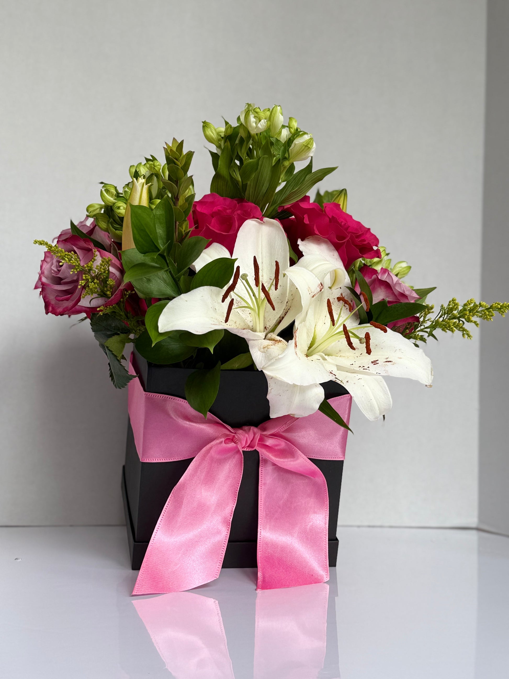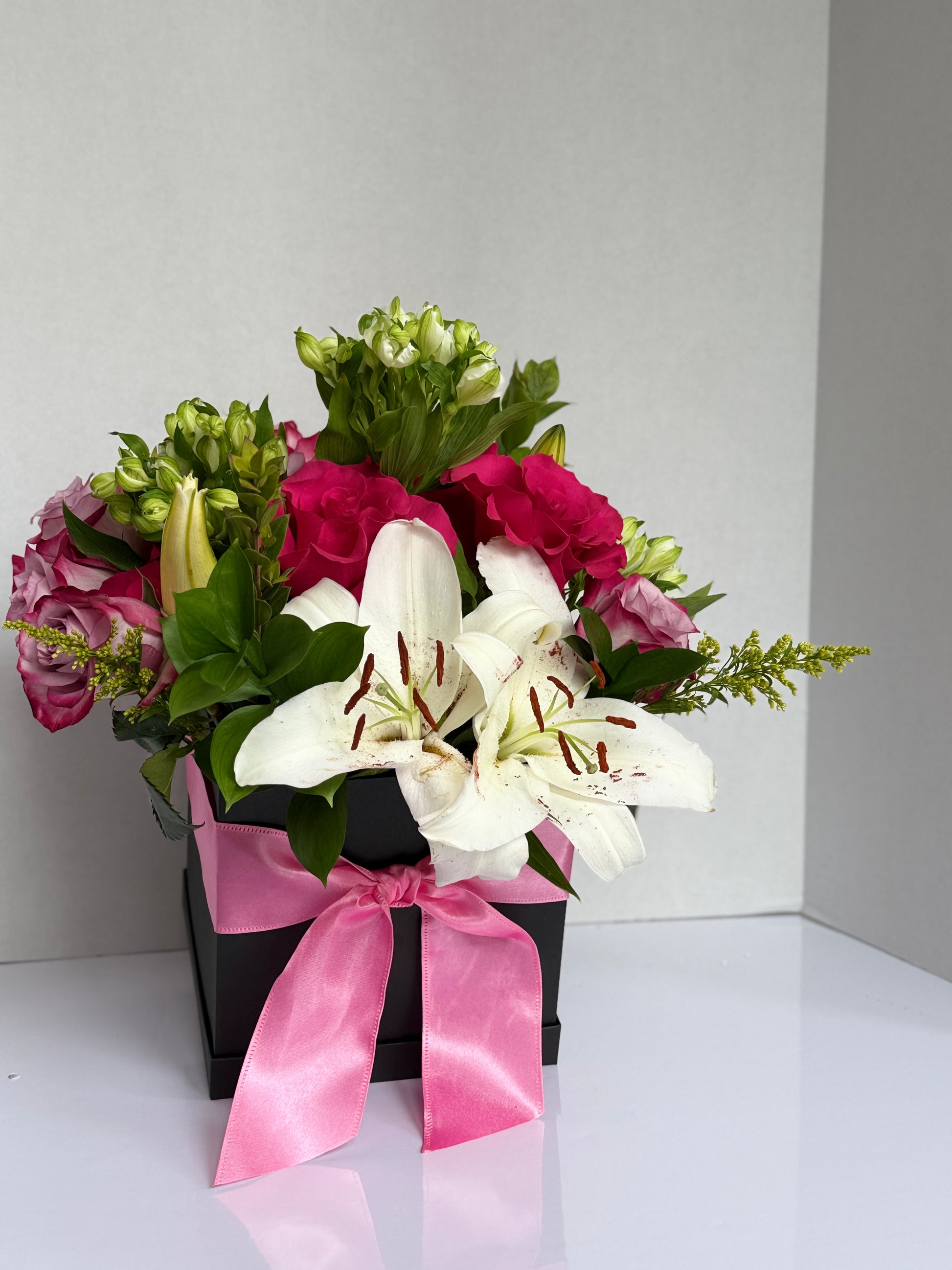 A stunning floral arrangement designed to captivate and impress. This sophisticated black box is filled with a harmonious blend of fresh pink roses, delicate white lilies, and lush greenery, accented with a luxurious satin pink ribbon.
